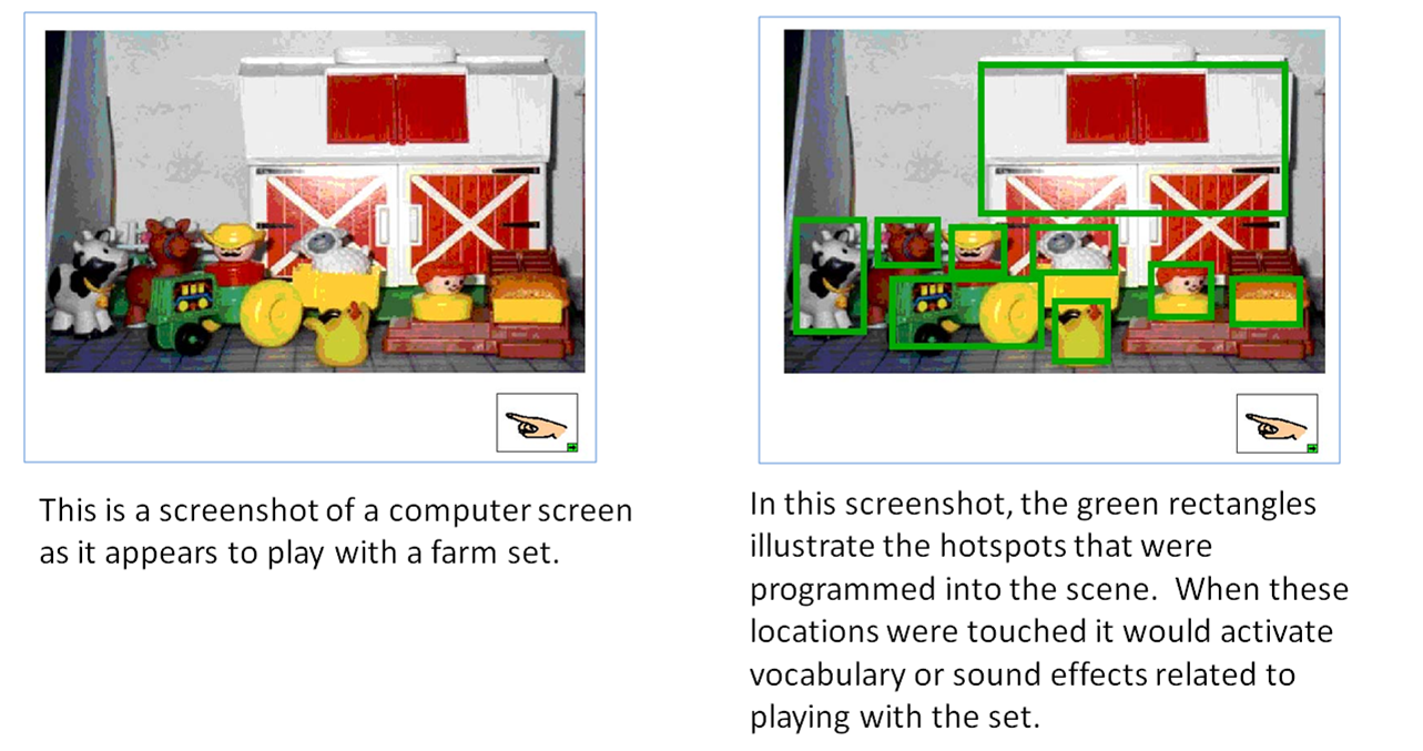 - Words, short phrases, or sound effects are programmed under "hotspots" in the scene.