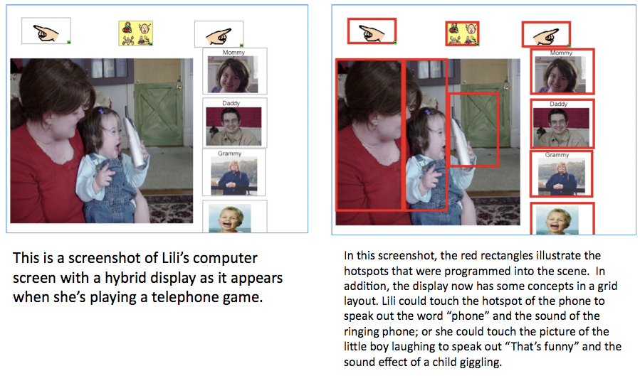- Click here to see an example of a hybrid display that combines a VSD with some additional symbols to expand communication opportunities. This display was used by Lili to expand upon the "telephone game" interactions with her mom and dad.