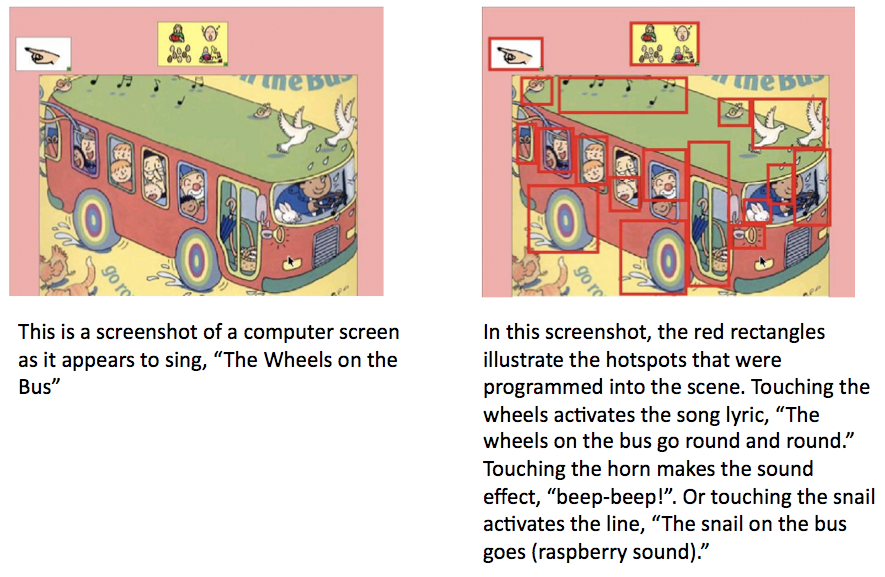 - For example, touching the wheels in the picture retrieves the lines from the song, “The wheels on the bus go round and round.”
