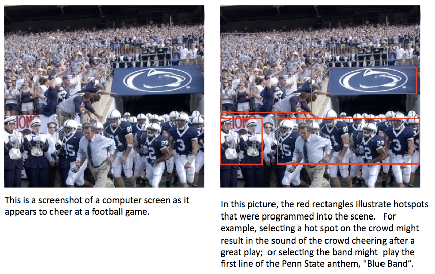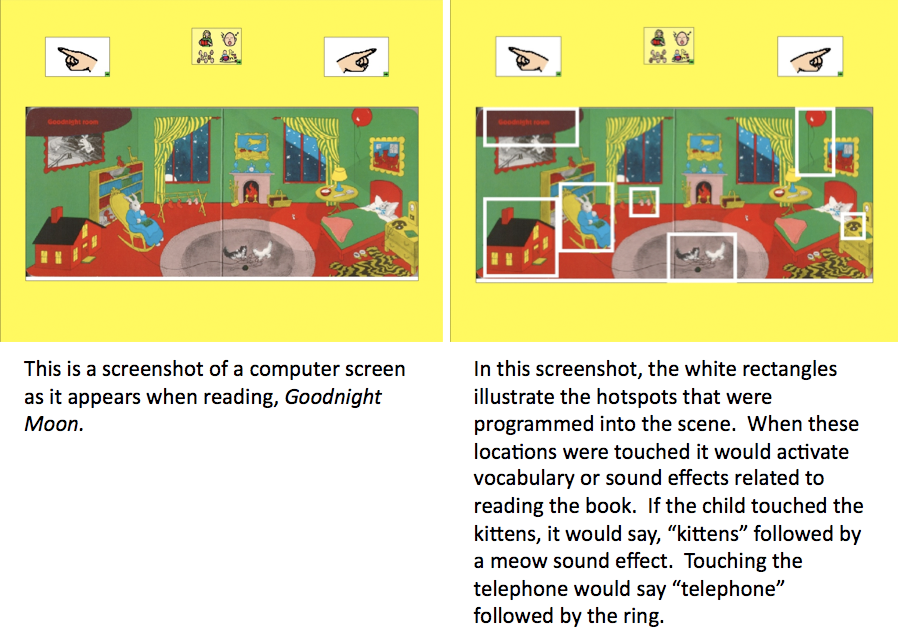 - Words, short phrases, or sound effects are programmed under "hotspots" in the scene.